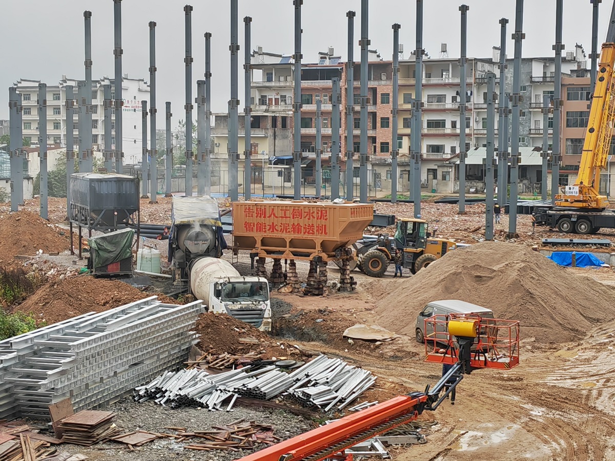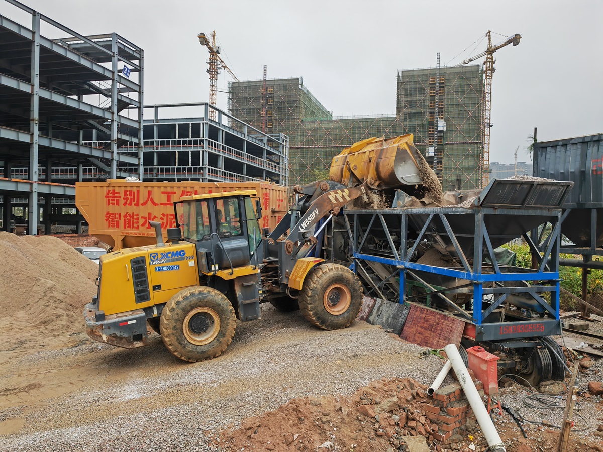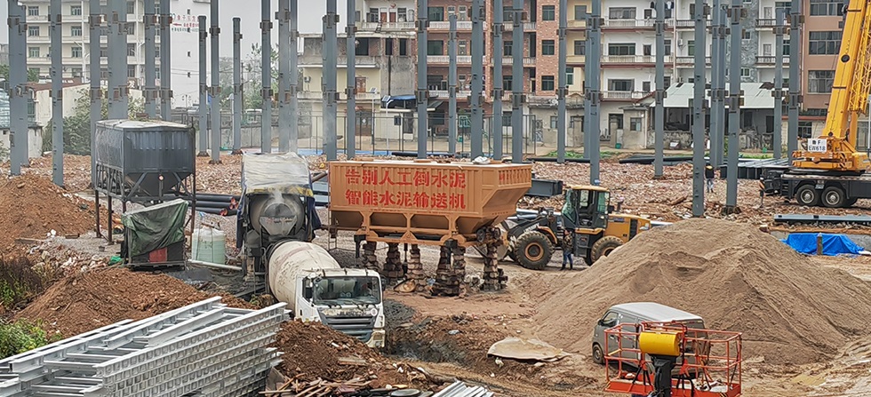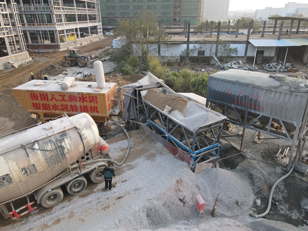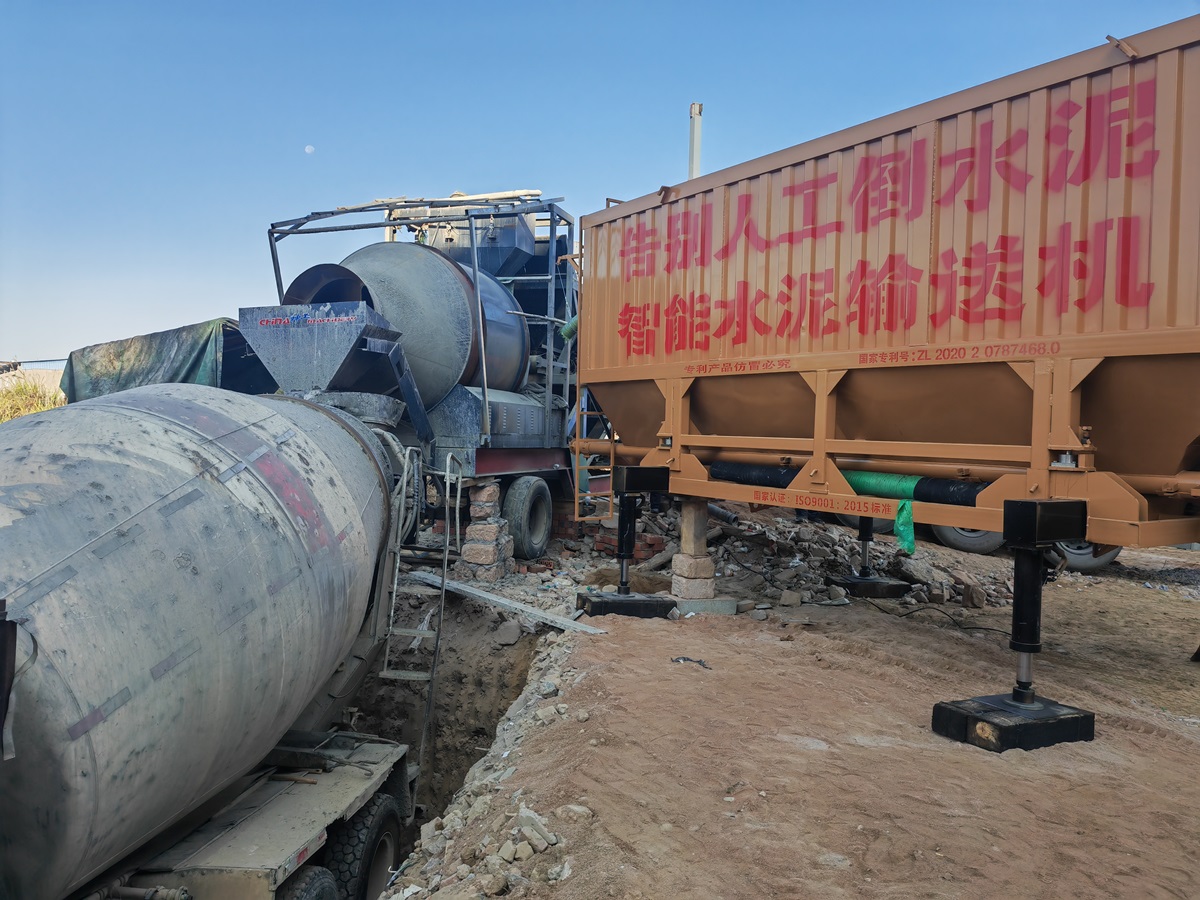 古河水泥輸送機(jī)新版50T搭配配料機(jī)、1.5方滾筒攪拌機(jī)施工。